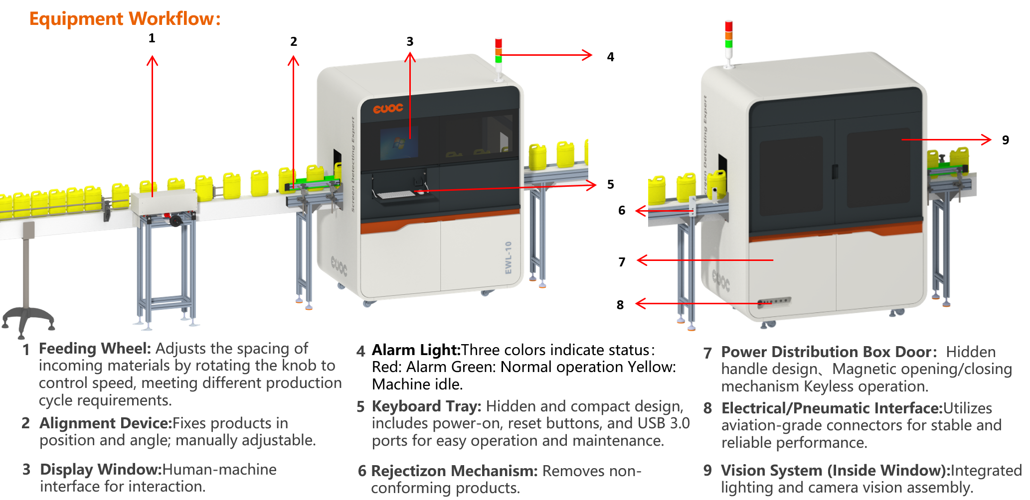 RegemMarr Daily Chemical Bottle Appearance Inspection Equipment (EWL-10), adopts AI artificial intelligence and the latest image processing algorithm technology, equipped with multiple high-resolution cameras and optical systems, developed to meet the high-quality requirements of high-end customers, is a precision optical device in the industry that completely replaces human eyes and provides high-quality assurance. Applicable industries: used for intelligent detection of bottles such as laundry detergent, disinfectant, toilet cleaner, shampoo, etc.